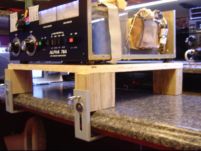 There is one problem with the stepped desk – that comes when servicing or R&R gear on that top shelf. The answer is this “service shelf” gadget which is a ¾ hunk of plywood and some feat, combined with a couple of utility features.