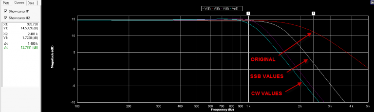 The results of the simulation can be seen in the plot below. The RED trace is the plot that the stock rig exhibits. SSB values in WHITE, and a pair of CW curves in purple and light blue.