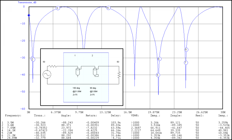 And here a transmission plot of the two stubs in series, as measured using the test jig. The key function points are circled. The 40m and 20m are not quite loss free - but in this application, we are shorting these elements to detune them. So we really don't need a perfect conductor - just enough of a connection between the dipole halves to keep the element from absorbing power on 40/20 - as would be the case if the dipole were insulated in the center. 15m likewise needs the element to appear open for least coupling, and the 15m stub gives a very nice dip for that purpose.