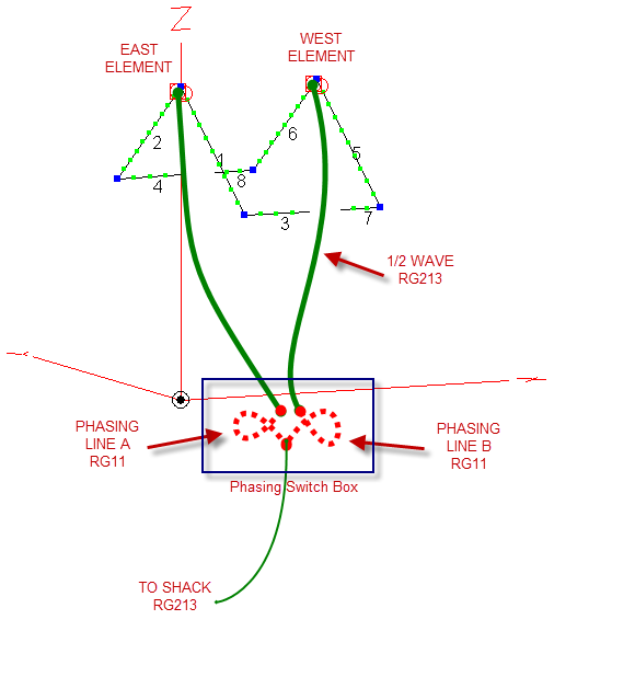 Operational diagram of the array shown here. The half wave lengths serve to duplicate the feed points of the two elements and help to avoid a lot of attic climbing!